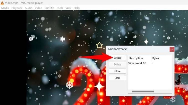 Từ thanh menu của VLC, chọn Phát lại > Dấu trang tùy chỉnh > Quản lý. Trên cửa sổ Chỉnh sửa dấu trang, nhấp vào "Tạo" để thêm dấu trang.