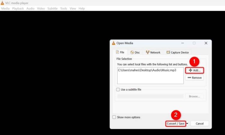 Để thực hiện chuyển đổi, hãy khởi chạy VLC và chọn Media > Convert/Save từ thanh menu. Trên cửa sổ mở ra, chọn "Add" và thêm tệp phương tiện bạn muốn chuyển đổi. Sau đó, ở phía dưới, nhấp vào "Convert/Save".