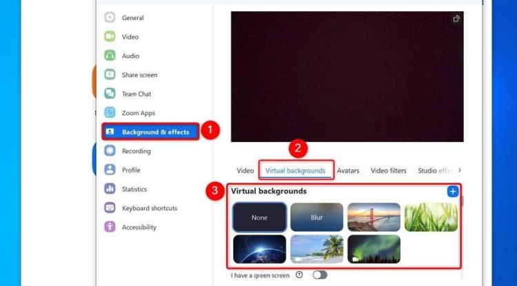 Từ thanh bên trái, chọn "Background & Effects." Trên ngăn bên phải, trong phần Virtual Backgrounds, bạn sẽ thấy nhiều tùy chọn khác nhau. Nếu bạn muốn làm mờ nền, hãy nhấp vào "Blur." Để thay thế nền bằng các hình ảnh có sẵn, hãy chọn một hình ảnh trong danh sách. Để thêm hình ảnh hoặc video của riêng bạn để sử dụng làm nền, hãy nhấp vào dấu cộng và chọn tùy chọn phù hợp.