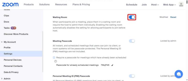 Để thực hiện điều đó, hãy khởi chạy trang web Zoom và đăng nhập vào tài khoản của bạn. Trong thanh bên trái, nhấp vào Tài khoản của tôi > Cài đặt. Trên ngăn bên phải, ở trên cùng, nhấp vào tab "Cuộc họp". Trong tab này, cuộn xuống và bật nút chuyển "Phòng chờ".