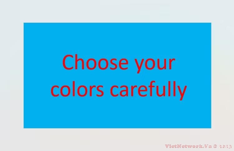 • Không sử dụng văn bản màu đỏ. Điều này thường bị trôi đi khi chiếu, đặc biệt là trên máy chiếu chất lượng kém hoặc nếu ánh sáng mặt trời chiếu vào màn hình chiếu của bạn. Sự kết hợp màu tệ nhất là xanh dương với đỏ và xanh lá cây với đỏ. Tránh những điều này bằng mọi giá!