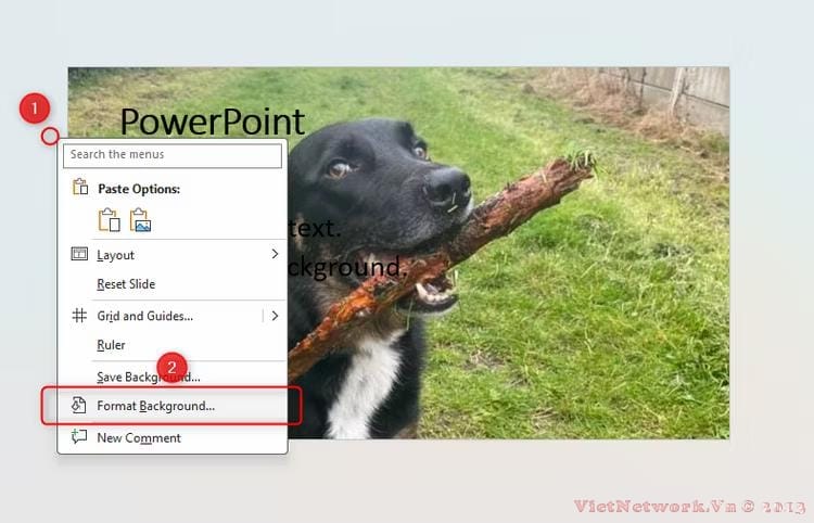 Để khắc phục điều này, chỉ cần sử dụng nền đơn giản. Tuy nhiên, nếu việc giữ hình ảnh là bắt buộc, hãy tăng độ trong suốt của nó. Nhấp chuột phải vào vùng màu xám xung quanh trang chiếu của bạn và nhấp vào "Định dạng nền".