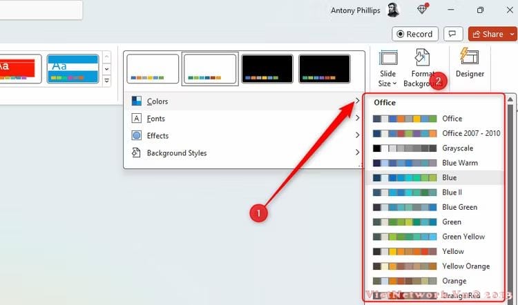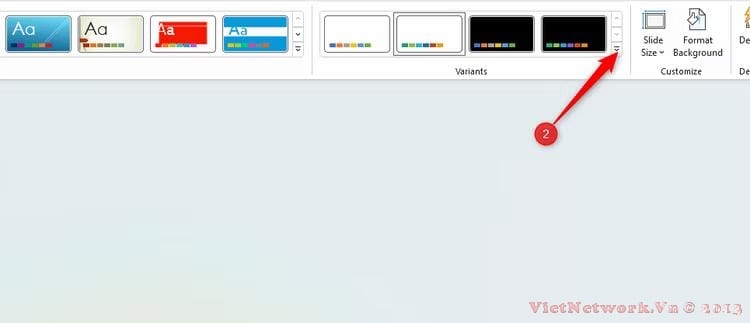 Cách tốt nhất để giải quyết vấn đề này là sử dụng cơ chế "Biến thể màu" của PPT. Trong tab "Thiết kế" trên ruy-băng, hãy chuyển đến nhóm "Biến thể" và nhấp vào mũi tên thả xuống.