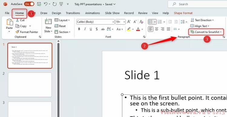 Nếu bạn đã nhập văn bản của mình và muốn chuyển đổi nó thành SmartArt, với hộp văn bản được đề cập đã chọn, hãy mở tab "Trang chủ" trên dải băng và trong nhóm Đoạn văn, hãy nhấp vào "Chuyển đổi sang SmartArt".