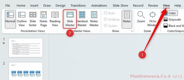 Tuy nhiên, tùy chọn tốt nhất là sử dụng Slide Master của PPT, bạn có thể truy cập thông qua tab "Xem" trên ribbon.