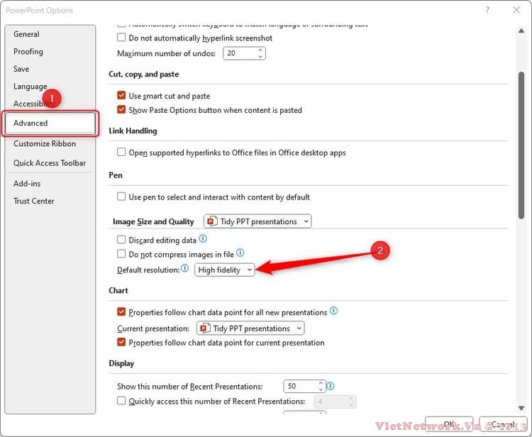Bạn cũng có thể buộc PPT sử dụng độ phân giải hình ảnh tối đa có thể. Để thực hiện việc này, hãy nhấp vào "Tệp" (ở trên cùng bên trái cửa sổ PPT của bạn) và mở "Tùy chọn" (ở cuối menu mở ra). Trong hộp thoại, nhấp vào "Nâng cao" và thay đổi "Độ phân giải mặc định" trong phần "Kích thước và chất lượng hình ảnh" thành "Độ trung thực cao".