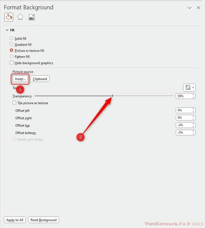 Trong ngăn mở ra, hãy chèn ảnh của bạn và di chuyển thanh trượt Độ trong suốt sang phải cho đến khi bạn hài lòng rằng văn bản có thể dễ dàng đọc được.