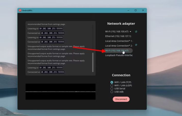 Sau khi cài đặt AndroidMic trên cả hai thiết bị, hãy mở ứng dụng AndroidMic trên màn hình nền. Bạn sẽ thấy ba mục: bộ điều hợp mạng, thiết bị âm thanh và kết nối. Hãy đảm bảo bạn chọn Wi-Fi từ menu bộ điều hợp mạng và Wi-Fi/LAN (TCP) cho kết nối. Sau đó, nhấp vào "Kết nối".