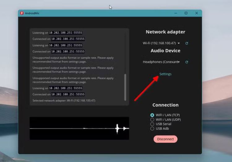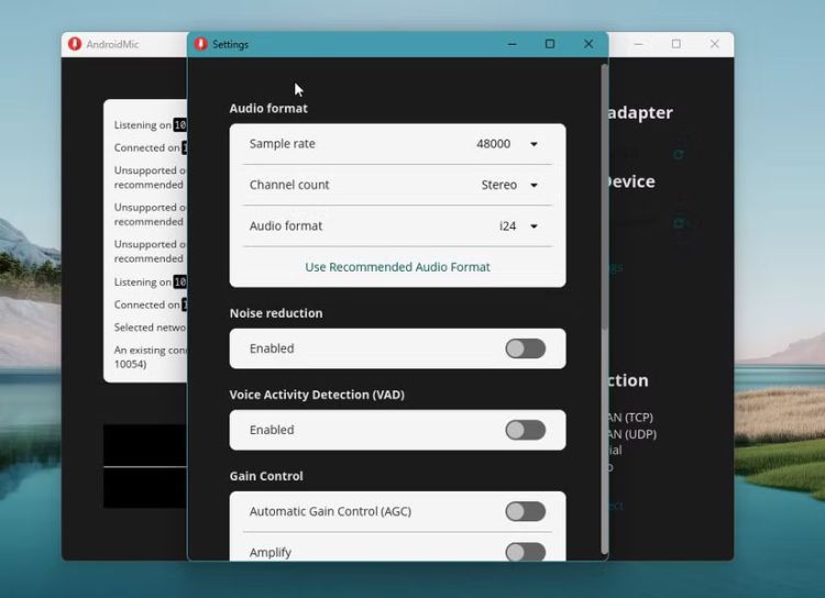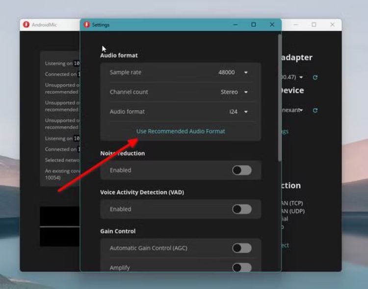 Khi nhấp vào "kết nối" trên PC lần đầu tiên, bạn có thể gặp lỗi như "định dạng âm thanh không được hỗ trợ" hoặc "tốc độ mẫu không được hỗ trợ". Cách dễ nhất để khắc phục lỗi này là nhấp vào nút "Cài đặt" ở khung bên phải và chọn "Sử dụng Định dạng Âm thanh Được Đề xuất". Ngoài ra, bạn có thể vuốt sang phải trong ứng dụng điện thoại và đảm bảo các cài đặt được liệt kê trong mục Ghi âm khớp với cấu hình định dạng âm thanh trên PC.