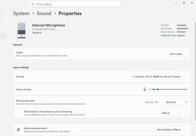 Sau đây là cách bạn có thể tắt micrô tích hợp của máy tính nếu cần. Mở ứng dụng Cài đặt và điều hướng đến Âm thanh > Thuộc tính. Tìm thanh trượt Âm lượng đầu vào và tắt tiếng.