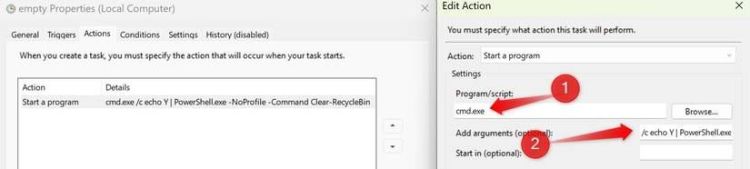 Để giải quyết vấn đề này, tôi sử dụng Task Scheduler để tự động làm trống thùng rác. Để thiết lập, hãy mở Task Scheduler, nhấp vào "Create Task", nhập tên và mô tả, và tạo một trình kích hoạt mới cho thời điểm bạn muốn thùng rác được làm trống. Sau đó, hãy chuyển đến tab "Actions", chọn "Start a Program" từ menu thả xuống và nhập cmd.exe vào trường Program/Script.