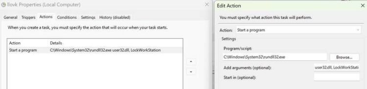 Để thực hiện việc này, hãy mở Task Scheduler, nhấp vào "Create Task", chuyển đến tab "Triggers", chọn "New", chọn "On Idle" làm trigger và nhấp vào "OK". Tiếp theo, trong tab "Actions", nhấp vào "New", chọn "Start a Program" và nhập C:\Windows\System32\rundll32.exe vào trường Program/Script với user32.dll LockWorkStation làm đối số. Nhấp vào "OK".