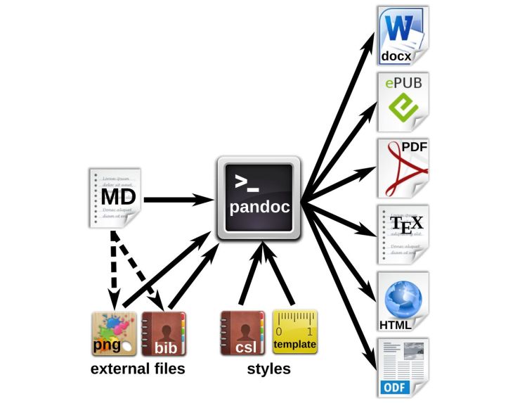 Pandoc có thể chuyển đổi giữa các tài liệu Word, Markdown, tệp LibreOffice, HTML và nhiều định dạng khác.