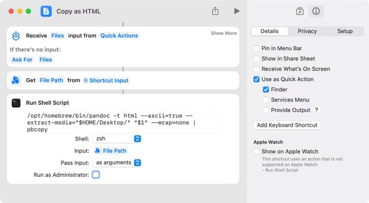 Tôi đã tạo một Shortcut mới để thêm tùy chọn menu chuột phải "Sao chép dưới dạng HTML" vào tài liệu trong Finder. Khi chạy, Shortcut sẽ chuyển đường dẫn tệp đến Pandoc, sau đó Pandoc sẽ dán mã HTML đã chuyển đổi vào bảng nhớ tạm của tôi. Vì Pandoc có thể tự động phát hiện định dạng tệp, tính năng này không chỉ áp dụng cho tài liệu Word.