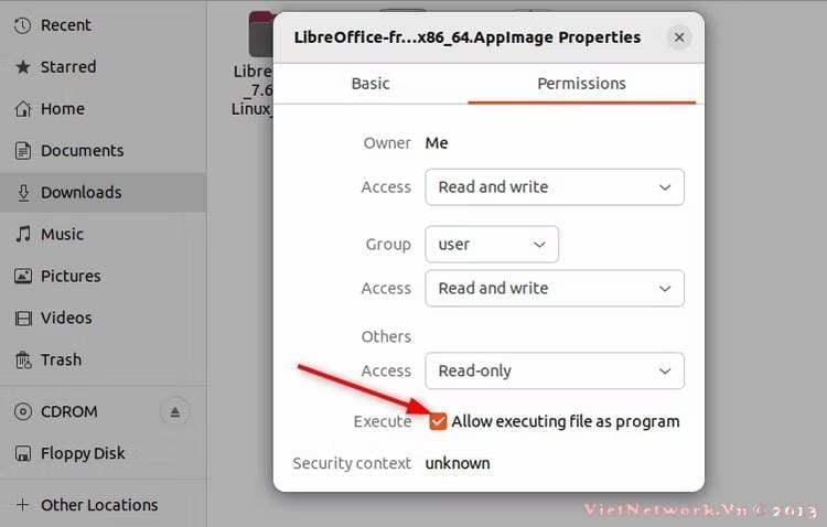 • Để sử dụng LibreOffice mà không cần cài đặt, trước tiên hãy tải xuống AppImage của nó. Sau đó, nhấp chuột phải vào tệp AppImage, đi tới thuộc tính tệp và chọn tùy chọn "Cho phép thực thi tệp dưới dạng chương trình". Sau đó, chạy AppImage để bắt đầu sử dụng LibreOffice.