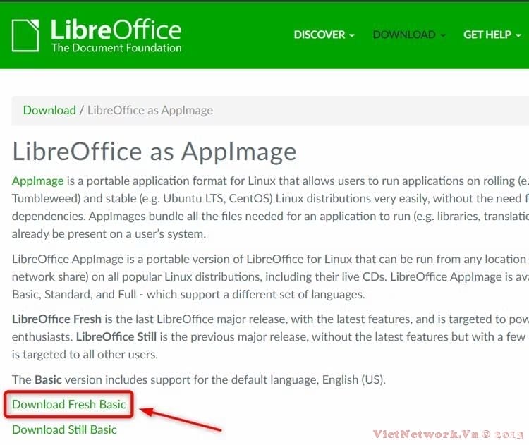 Để tải xuống và chạy LibreOffice AppImage, trước tiên hãy truy cập trang LibreOffice AppImage và nhấp vào nút "Tải xuống Fresh Basic".