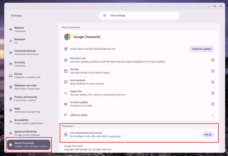 Để bắt đầu, hãy vào ứng dụng Cài đặt, sau đó điều hướng đến Giới thiệu về ChromeOS và cuộn xuống phần Nhà phát triển.