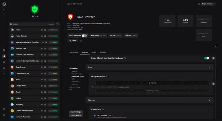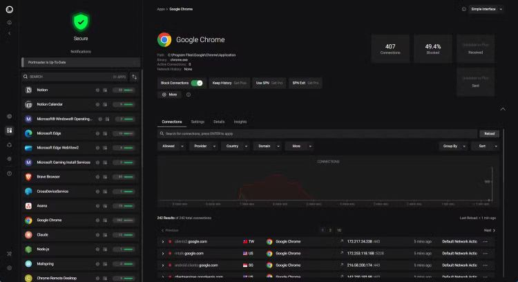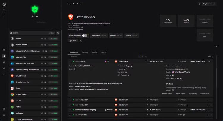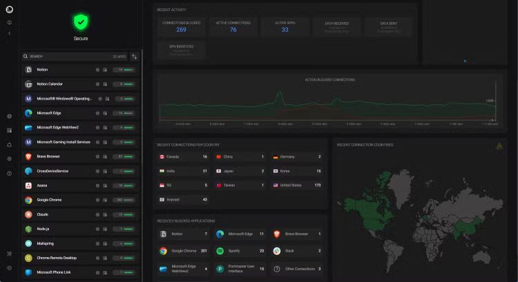 Bảng điều khiển chính hiển thị biểu đồ thời gian thực về các kết nối đang hoạt động và bị chặn, cùng với danh sách tất cả các ứng dụng hiện đang kết nối với Internet. Bạn có thể xem chi tiết từng ứng dụng để biết chính xác tên miền nào chúng đang kết nối, lượng dữ liệu chúng đang tải lên và tải xuống, cũng như thời điểm bắt đầu và kết thúc của mỗi kết nối.