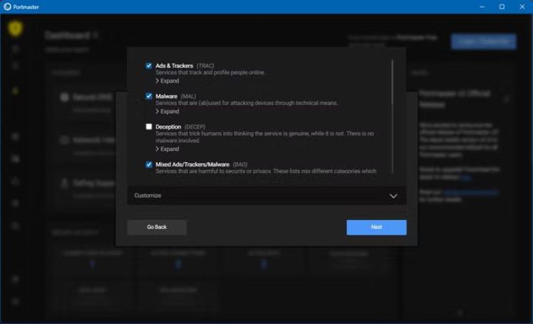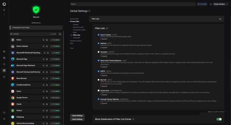 Một trong những tính năng tốt nhất của Portmaster là tự động theo dõi và chặn phần mềm độc hại. Trong quá trình thiết lập, bạn có thể bật nhiều danh sách bộ lọc khác nhau để chặn các trình theo dõi đã biết, tên miền độc hại, trang web lừa đảo và thậm chí cả nội dung người lớn. Tất nhiên, bạn cũng có thể thêm (hoặc xóa) bộ lọc sau khi thiết lập bằng cách vào Cài đặt > Bộ lọc Quyền riêng tư > Danh sách Bộ lọc.