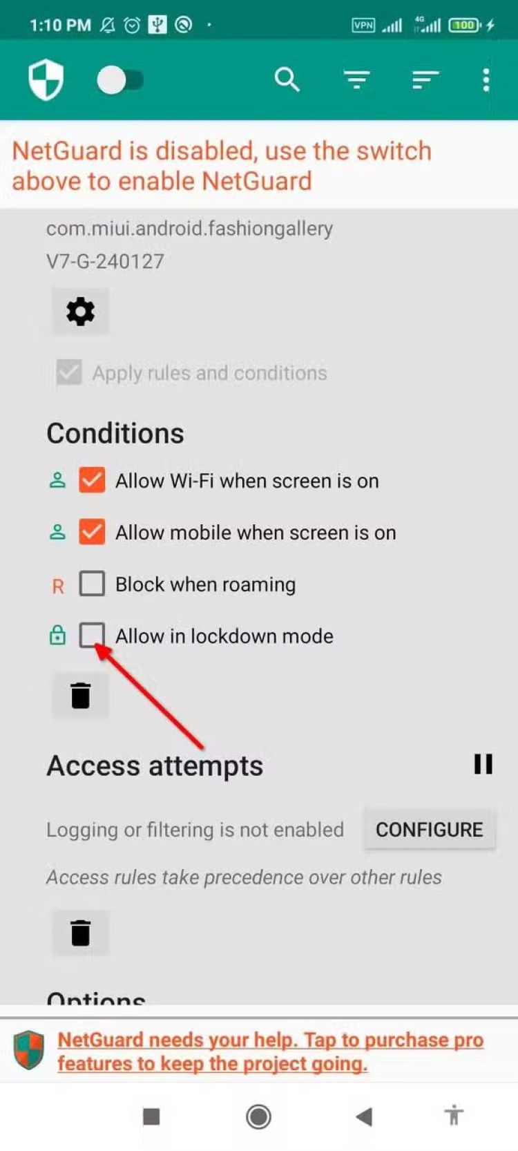 Trong hầu hết các trường hợp sử dụng, bạn không nên tắt toàn bộ quyền truy cập internet cho tất cả các ứng dụng. NetGuard cũng cho phép bạn cho phép các ứng dụng được chọn bỏ qua các hạn chế Lưu lượng Truy cập Khóa. Nhấn vào tên ứng dụng để hiển thị thêm bộ lọc cho ứng dụng đó. Tại đây, bạn có thể nhấn "Cho phép ở chế độ khóa" để thêm ứng dụng vào danh sách cho phép. Bạn có thể thêm nhiều ứng dụng vào danh sách cho phép và duy trì chế độ khóa.