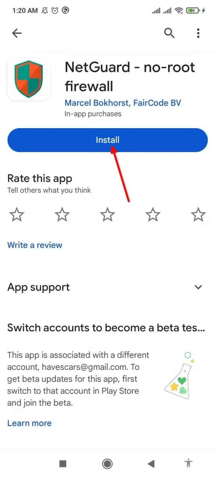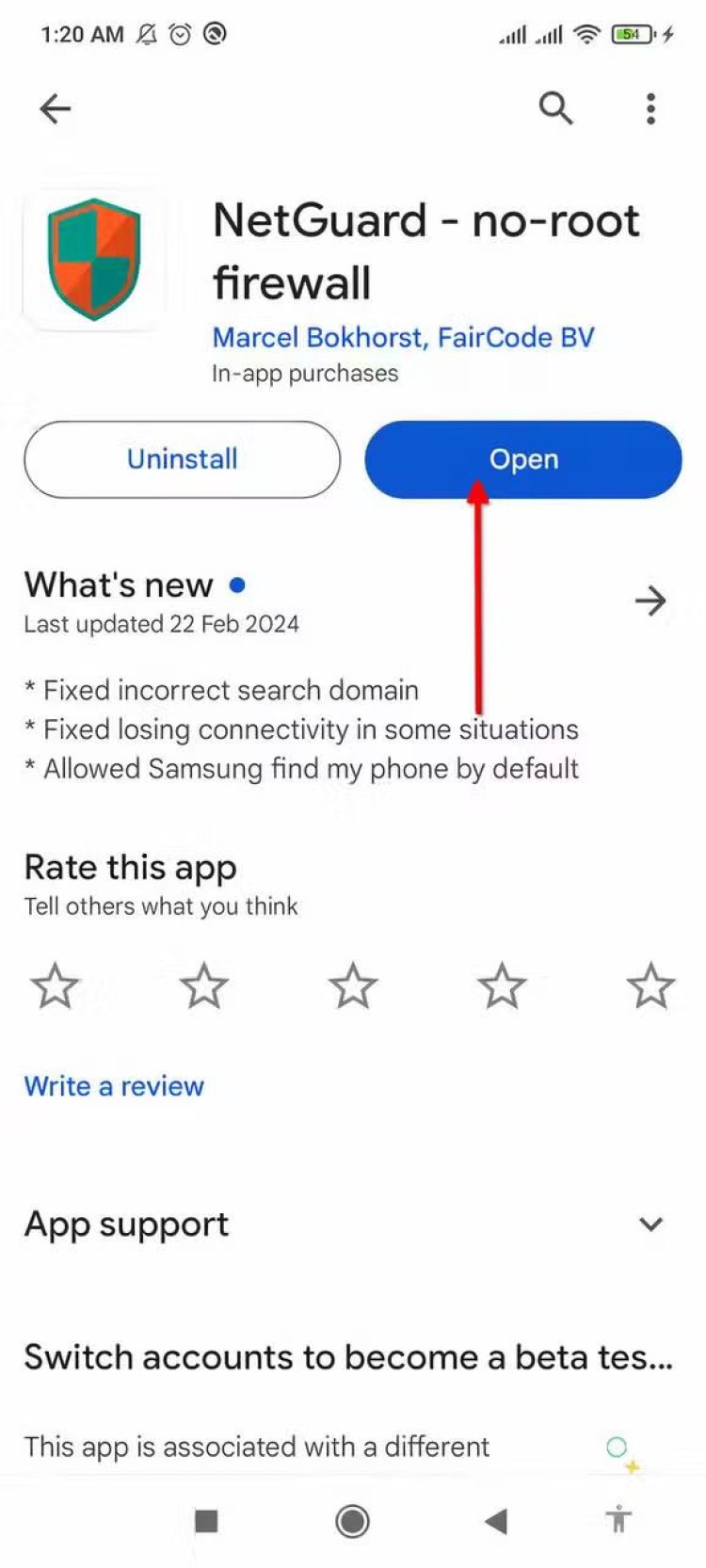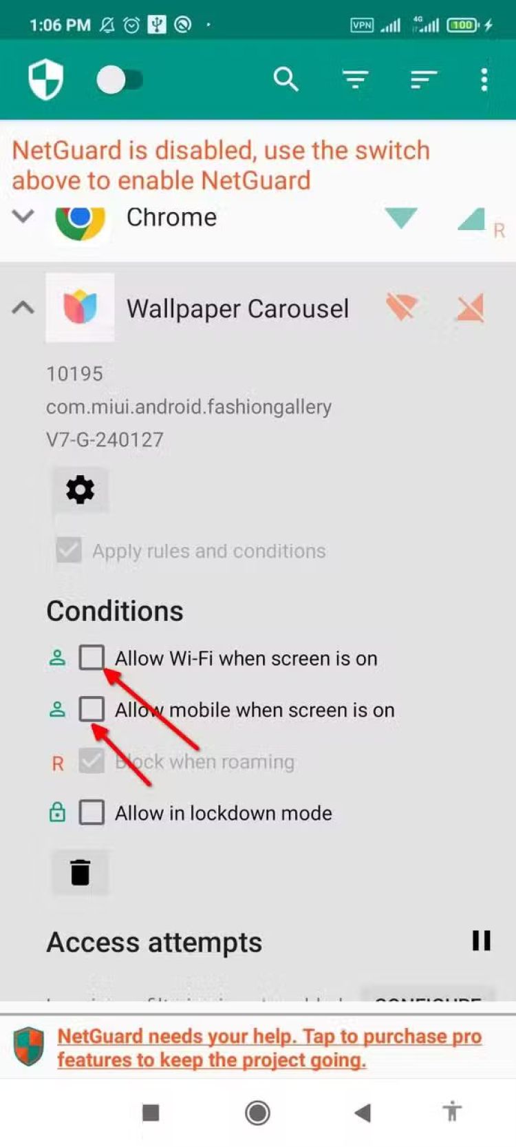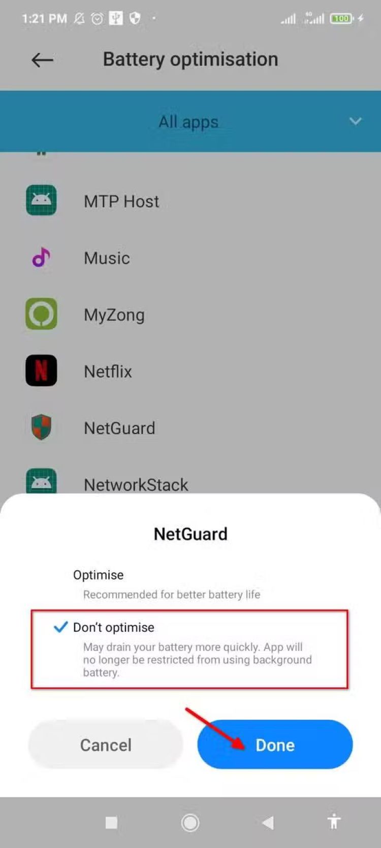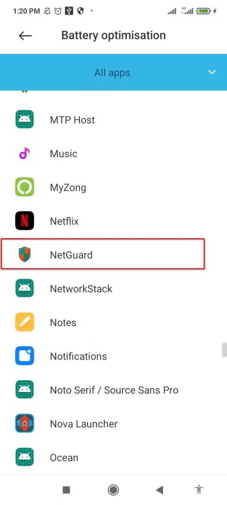 Theo mặc định, Android quản lý cách ứng dụng chạy nền để tiết kiệm pin, nghĩa là hệ thống có thể tắt ngẫu nhiên ứng dụng đã cài đặt. Để ứng dụng NetGuard tiếp tục hoạt động ở chế độ nền, chúng tôi sẽ loại trừ NetGuard khỏi các biện pháp tối ưu hóa pin của Android. Ứng dụng sẽ nhắc bạn làm điều đó, nhưng nếu bạn bỏ lỡ, chỉ cần vào cài đặt của ứng dụng và nhấn "Không cho phép" trên tính năng tối ưu hóa pin nền.