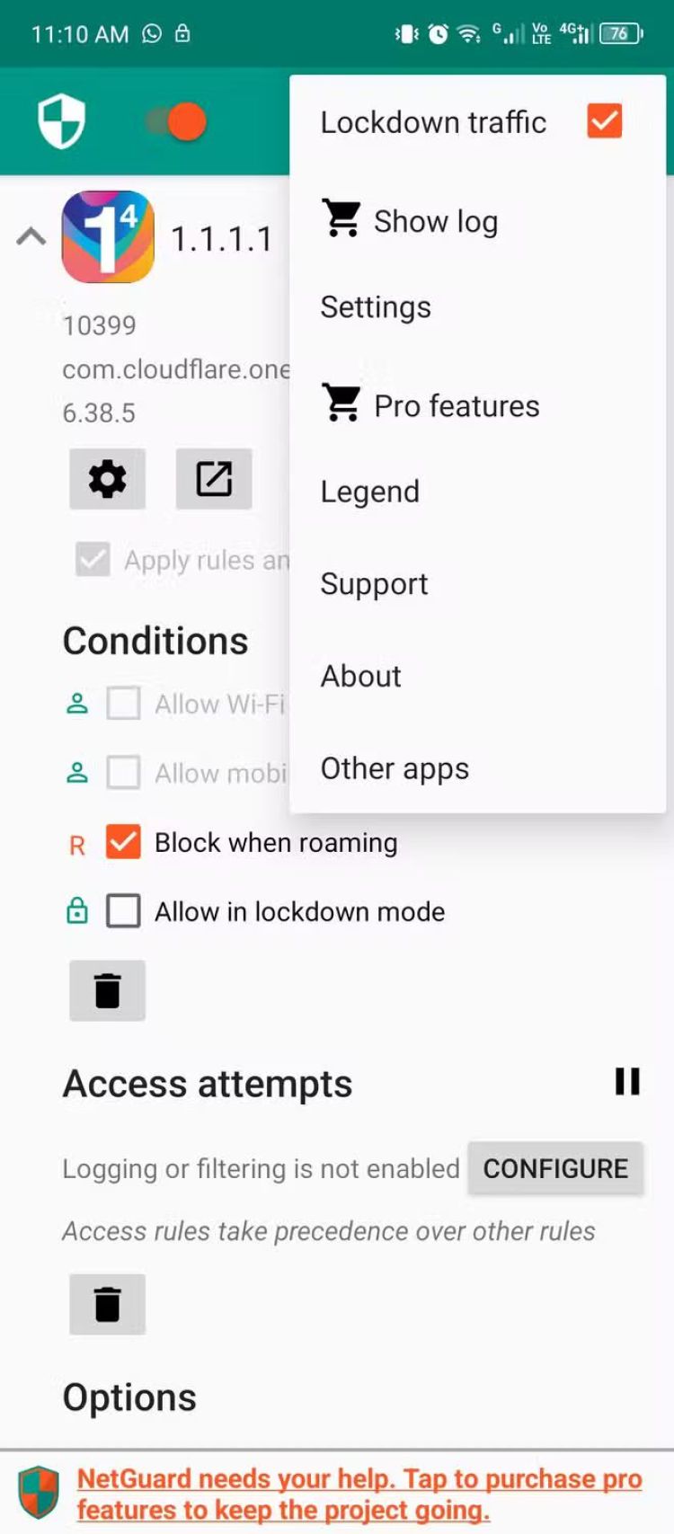 Nếu bạn có một danh sách dài các ứng dụng và muốn chặn tất cả cùng một lúc, bạn không cần phải cuộn qua toàn bộ danh sách và nhấn nút chuyển đổi cho từng ứng dụng để quản lý truy cập internet. Đó chính là mục đích của chế độ Khóa Lưu lượng. Ở chế độ Khóa Lưu lượng, NetGuard sẽ chặn lưu lượng internet từ tất cả các ứng dụng đã cài đặt trên điện thoại. Nhấn vào biểu tượng ba chấm ở góc và chọn "Khóa Lưu lượng" để bật chế độ này.