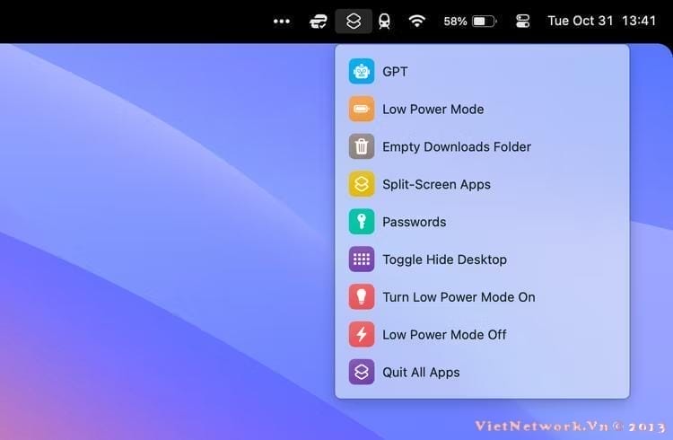 Thanh menu được tổ chức tốt sẽ hiển thị nhanh các thông tin như thời gian và mức pin của bạn, đồng thời cung cấp quyền truy cập nhanh vào các ứng dụng bạn sử dụng nhiều như VPN hoặc lịch sử khay nhớ tạm của bạn. Loại bỏ phiền nhiễu khỏi thanh menu có thể giúp bạn tập trung tốt hơn vào nhiệm vụ trước mắt.