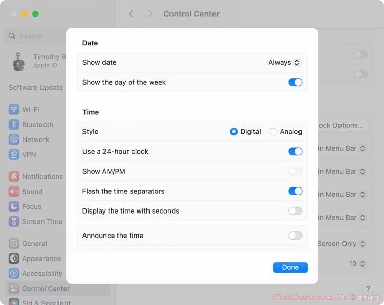 macOS cũng cho phép bạn tùy chỉnh hiển thị ngày giờ ở góc trên bên phải màn hình. Đi tới Cài đặt hệ thống > Trung tâm điều khiển > Đồng hồ và nhấp vào "Tùy chọn đồng hồ..." để mở bảng cài đặt mới cho việc này.