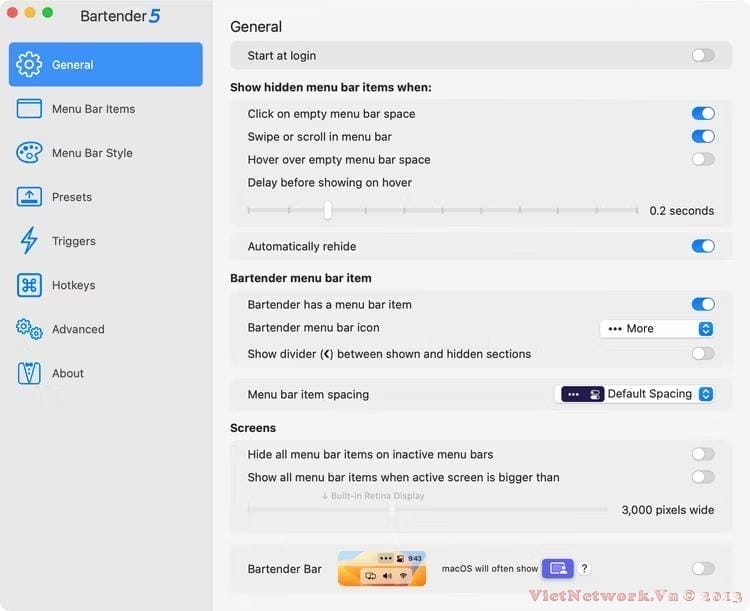 Bartender là một ứng dụng trị giá 16 USD với bản dùng thử kéo dài 4 tuần được xây dựng dựa trên ý tưởng này. Theo mặc định, Bartender đặt một dấu chấm lửng nhỏ (...) ở bên trái thanh menu của bạn. Giữ Command sau đó nhấp và kéo các biểu tượng sang bên trái biểu tượng này để ẩn chúng. Hiển thị và truy cập các biểu tượng ẩn của bạn bằng cách nhấp vào dấu chấm lửng. Chúng sẽ biến mất lần nữa khi bạn bỏ con trỏ đi.