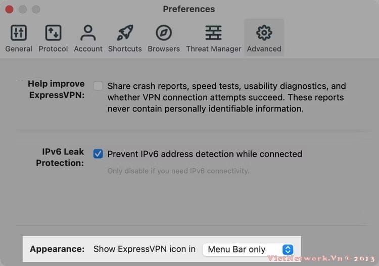 Bạn không thể loại bỏ các biểu tượng ứng dụng của bên thứ ba bằng phương pháp Lệnh và kéo. Cách dễ nhất để loại bỏ những thứ này là thay đổi cài đặt cho phép chúng trong ứng dụng được liên kết. Một số ứng dụng, như ExpressVPN, cho phép bạn quyết định hiển thị biểu tượng trên thanh công cụ, trên thanh menu hay cả hai.