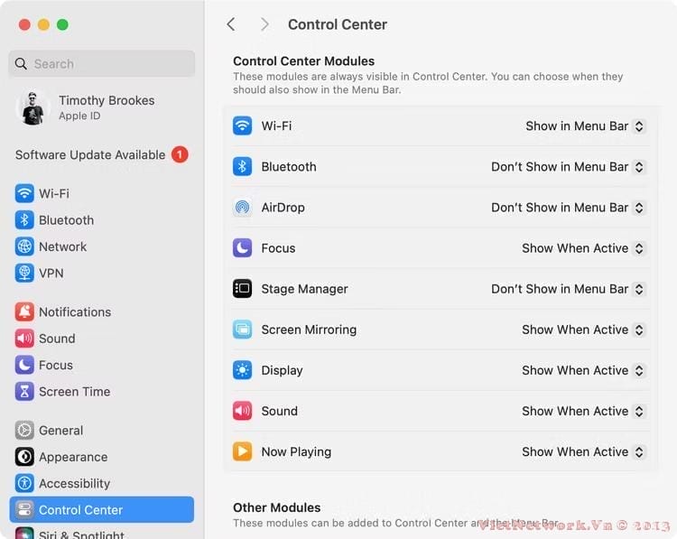 Bây giờ bạn đã tạo được một khoảng trống trên thanh menu, đã đến lúc lấp đầy nó bằng các biểu tượng hữu ích hơn. Bạn sẽ tìm thấy một số tùy chọn này trong Cài đặt hệ thống > Trung tâm điều khiển, bao gồm biểu tượng Đang phát, hoạt động cho các ứng dụng như Âm nhạc, Spotify và thậm chí cả các trang web Safari.