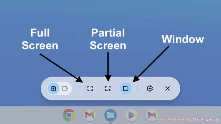 Thao tác này sẽ mở công cụ chụp màn hình, có nút chuyển để thay đổi từ chế độ chụp màn hình (biểu tượng máy ảnh) hoặc chế độ ghi màn hình (biểu tượng máy quay video). Có ba nút cho cả hai chế độ: chụp toàn bộ màn hình, chụp một vùng trên màn hình hoặc chụp một cửa sổ cụ thể.