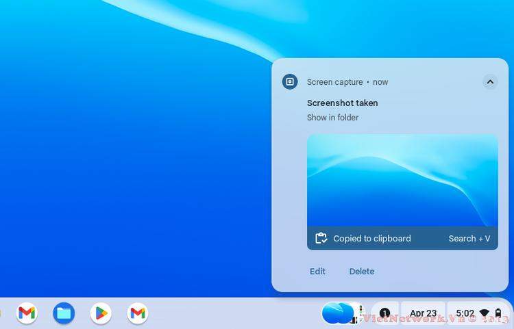 Khi bạn chụp ảnh màn hình, ảnh sẽ xuất hiện ở góc dưới bên phải màn hình và tự động được sao chép vào khay nhớ tạm trên Chromebook của bạn. Bạn có thể ngay lập tức "Chỉnh sửa" hoặc "Xóa" ảnh chụp màn hình khỏi hình thu nhỏ xem trước. Hình ảnh cũng sẽ được lưu vào thư mục Tải xuống của bạn, trừ khi bạn thay đổi đích đến sang thư mục khác.