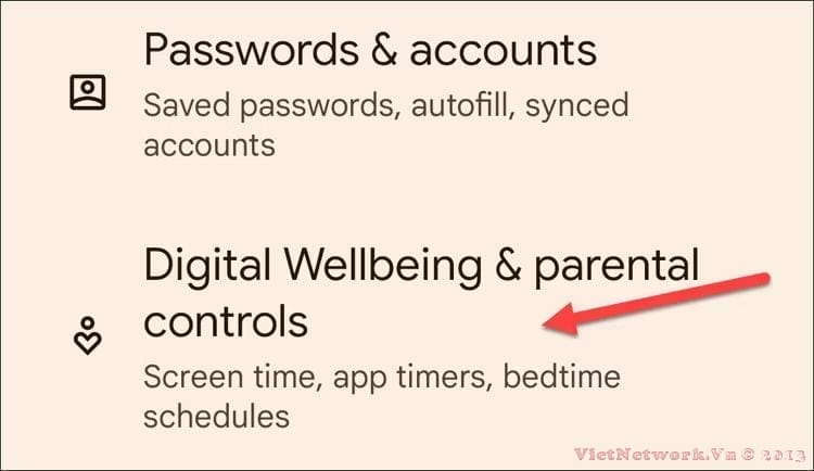 Tiếp theo, nhấn vào "Sức khỏe kỹ thuật số & Kiểm soát của phụ huynh".