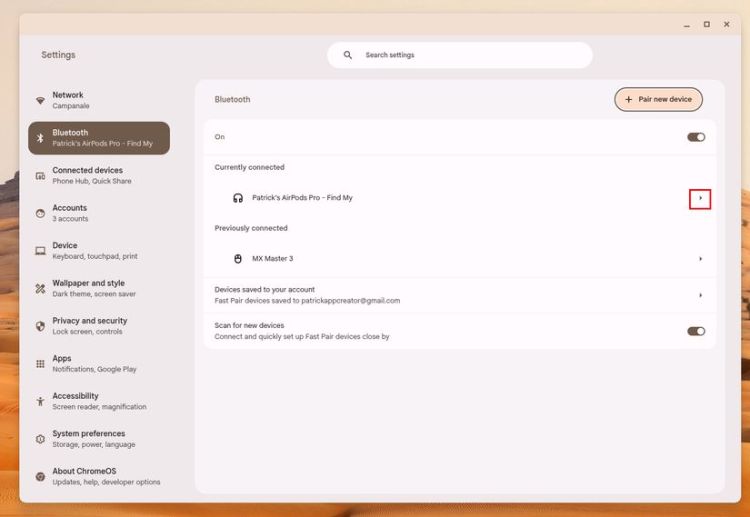 Nhấp vào tên AirPods của bạn trên Chromebook