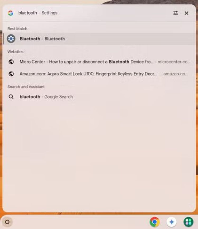Để bắt đầu quá trình ghép nối, hãy khởi chạy ứng dụng Cài đặt của Chromebook và điều hướng đến Bluetooth. Bạn có thể nhanh chóng chuyển đến đó bằng cách nhấp vào nút tìm kiếm trên bàn phím Chromebook và nhập Bluetooth hoặc bằng cách nhấp vào thanh dock ở góc dưới bên phải, chọn Bluetooth, sau đó Thêm thiết bị.
