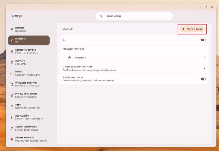 Sau khi mở cài đặt Bluetooth trên Chromebook, hãy nhấp vào Ghép nối thiết bị mới để bắt đầu tìm kiếm các thiết bị Bluetooth đang ở chế độ ghép nối.