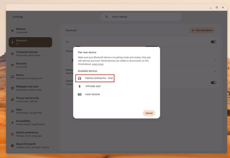 Quay lại Chromebook, bây giờ bạn sẽ thấy AirPods của mình bật lên trong hộp ghép nối. Chọn chúng và chúng sẽ được ghép nối trong vòng vài giây.