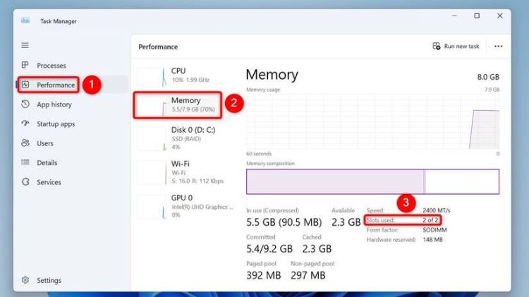 Bạn có thể kiểm tra thông tin RAM hiện đang được cài đặt từ Trình quản lý tác vụ. Để thực hiện việc đó, hãy nhấp chuột phải vào thanh tác vụ Windows và chọn "Trình quản lý tác vụ". Trong thanh bên trái, nhấp vào "Hiệu suất". Trên ngăn bên phải, chọn "Bộ nhớ". Bên cạnh Slots Used, bạn sẽ thấy có khe cắm nào khả dụng để thêm RAM không.