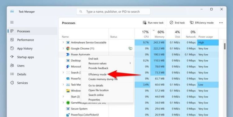Sau đó, để tắt Chế độ hiệu quả, hãy nhấp chuột phải vào ứng dụng và chọn "Chế độ hiệu quả".