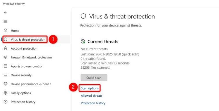 Bạn có thể chọn phần mềm diệt vi-rút theo ý muốn hoặc Microsoft Defender Antivirus tích hợp để thực hiện việc đó. Để sử dụng phần mềm sau, hãy khởi chạy Windows Search (nhấn Windows+S), nhập Windows Security và mở ứng dụng. Chọn "Virus & Threat Protection" trong ứng dụng và chọn "Scan Options".