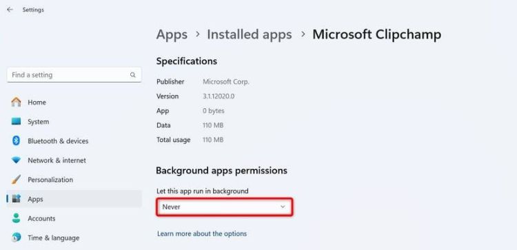 Tìm một ứng dụng chạy trong nền. Bên cạnh ứng dụng, nhấp vào ba dấu chấm và chọn "Tùy chọn nâng cao". Trên màn hình tiếp theo, nhấp vào menu thả xuống "Cho phép ứng dụng này chạy trong nền" và chọn "Không bao giờ".