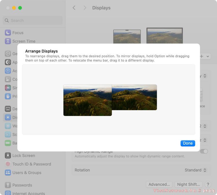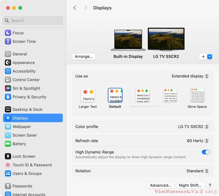 Trên máy Mac, bạn có thể thực hiện tương tự trong Cài đặt hệ thống > Hiển thị. Nhấp vào TV của bạn khi nó xuất hiện trong menu, sau đó chọn độ phân giải, tốc độ làm mới, xoay và chuyển đổi chế độ HDR nếu có. Bạn có thể chọn giữa việc phản chiếu màn hình Mac bên trong của mình (nếu có) hoặc dưới dạng "Màn hình mở rộng" để thêm một đầu ra khác.