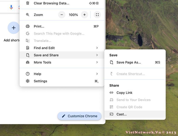 Để bắt đầu, hãy khởi chạy Chrome, nhấp vào menu ba chấm (Thêm), sau đó điều hướng đến Lưu và chia sẻ > Truyền và chọn thiết bị mục tiêu.