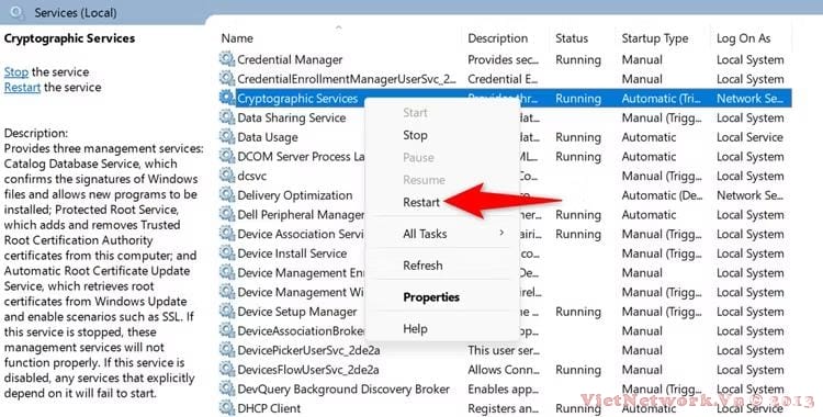 Tương tự, nhấp chuột phải vào dịch vụ "Dịch vụ mật mã" và chọn "Khởi động lại".