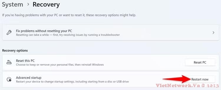 Để khởi động PC chạy Windows 11 của bạn ở chế độ an toàn, hãy đi tới Cài đặt > Hệ thống > Khôi phục. Bên cạnh "Khởi động nâng cao", nhấp vào "Khởi động lại ngay".