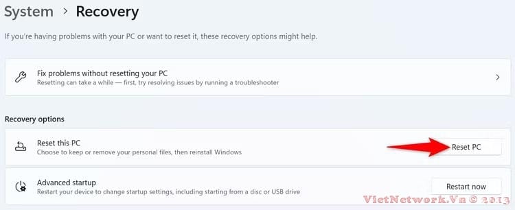 Để đặt lại PC chạy Windows 11, hãy điều hướng đến Cài đặt > Hệ thống > Khôi phục. Bên cạnh "Đặt lại PC này", nhấp vào "Đặt lại PC".