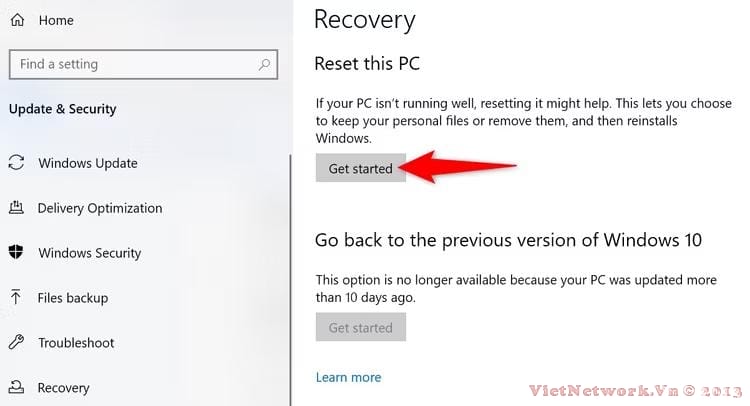 Để đặt lại PC chạy Windows 10, hãy đi tới Cài đặt > Cập nhật & Bảo mật > Khôi phục. Trong phần "Đặt lại PC này", nhấp vào "Bắt đầu".