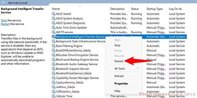 Tìm dịch vụ có tên "Dịch vụ truyền thông minh nền". Nhấp chuột phải vào nó và chọn "Khởi động lại."