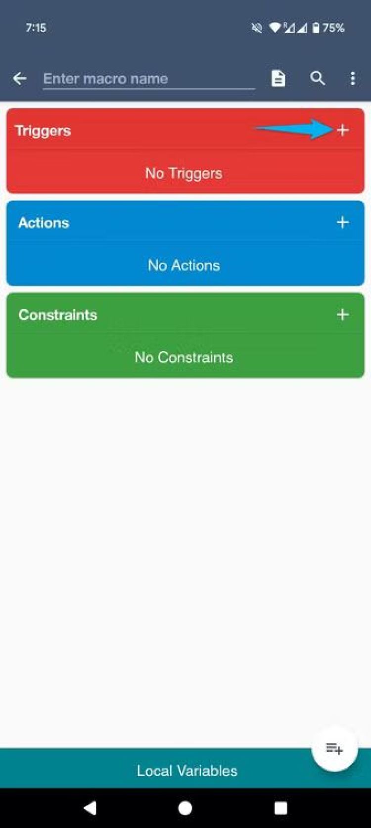 Để bắt đầu, hãy khởi chạy Google Play Store trên điện thoại của bạn và tải xuống và cài đặt ứng dụng MacroDroid. Khởi chạy ứng dụng và đi qua các màn hình chào mừng. Trên giao diện chính của ứng dụng, chọn "Add Macro". Trong phần Triggers, chạm vào dấu "+" (cộng) để thêm một trigger mới.